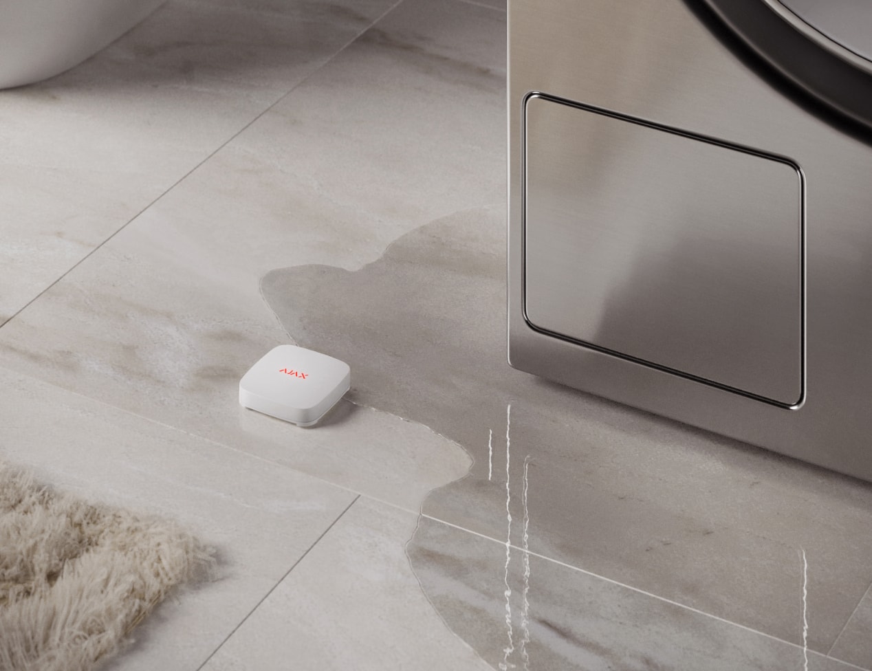 LeaksProtect peut être placé n'importe où, même dans les endroits les plus difficiles d'accès. Il est facile à installer, jouit d'une autonomie de plusieurs années et fonctionne 24h/24 et 7j/7. En cas de fuite au niveau de votre lave-linge ou au niveau d'un tuyau, le détecteur réagit immédiatement et signale un incident. Et si le local dispose d'un système anti-inondation, le système Ajax fermera automatiquement l'arrivée d'eau.